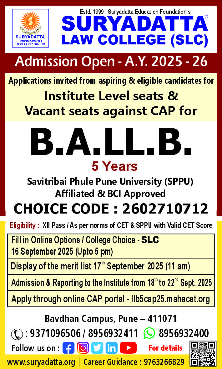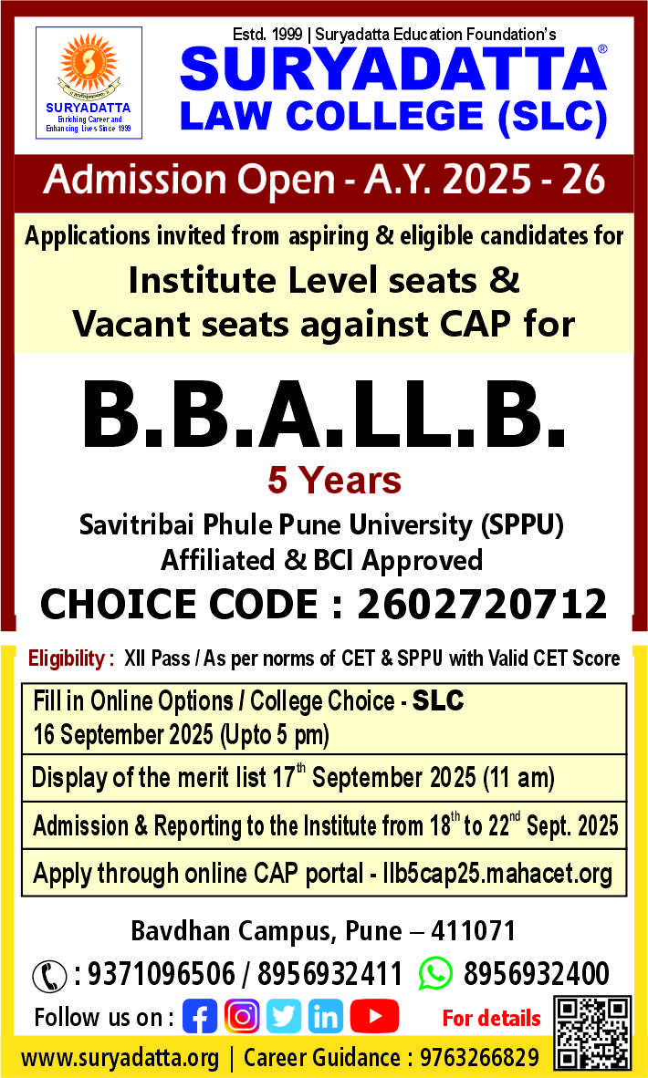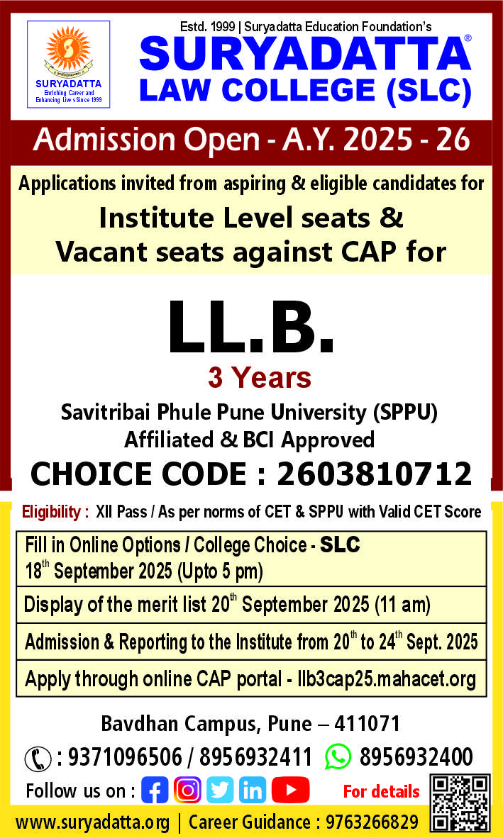 Suryadatta Law College (SLC) is affiliated to Savitribai Phule Pune University (SPPU), Pune. It is approved by the Bar Council of India, New Delhi and recognized by the Government of Maharashtra.